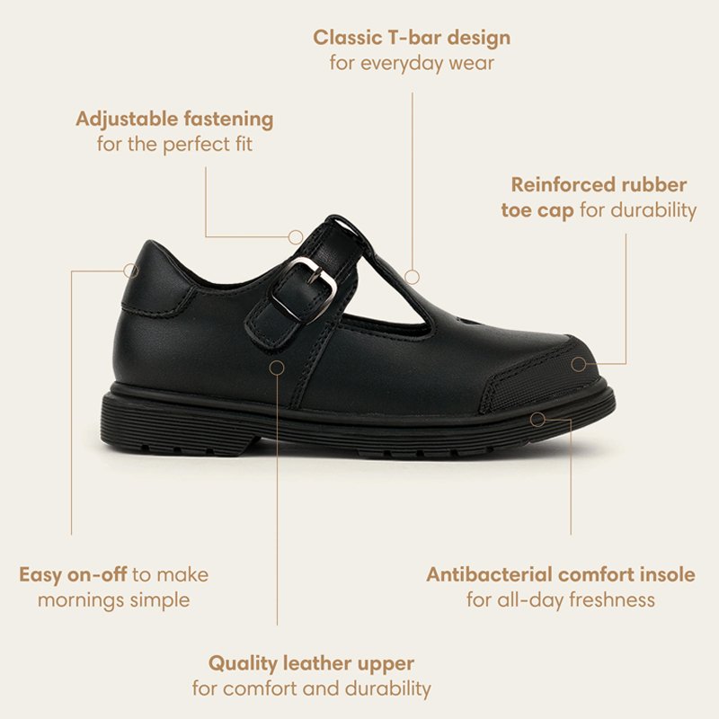Athena is a classic girls T-bar school shoe with a timeless silhouette and thoughtful design.