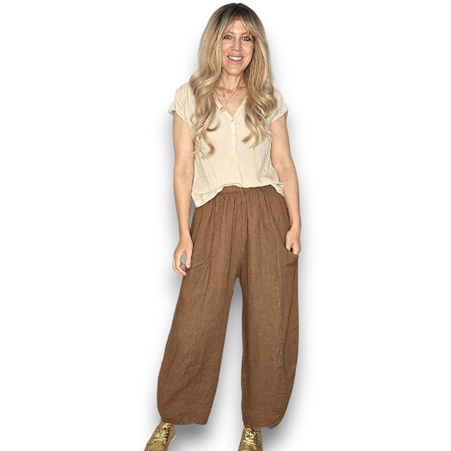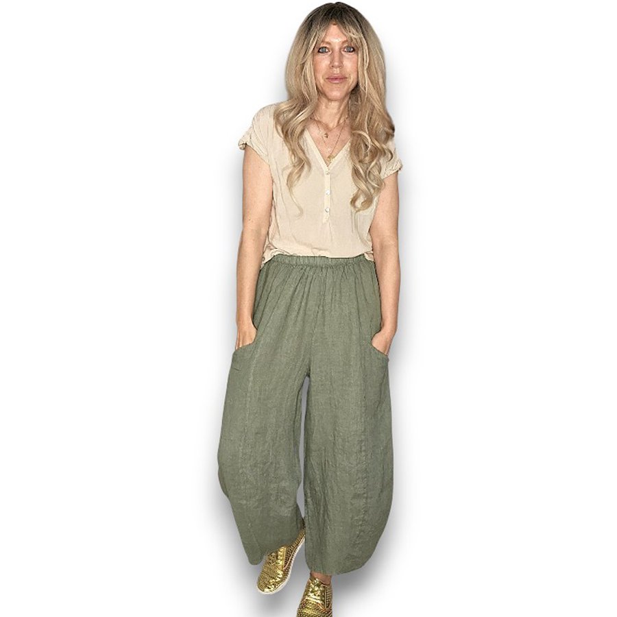 Wide and super comfortable Linen Pants with soft linen elastic waist, featuring front outer pockets.