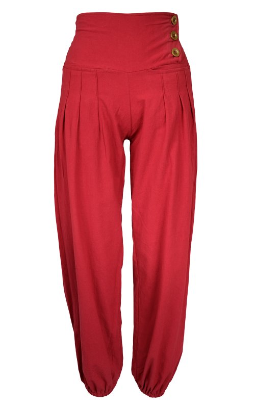 A light weight, 100% Cotton harem style pant, with button up front and a shirred elastic waist band at the back.