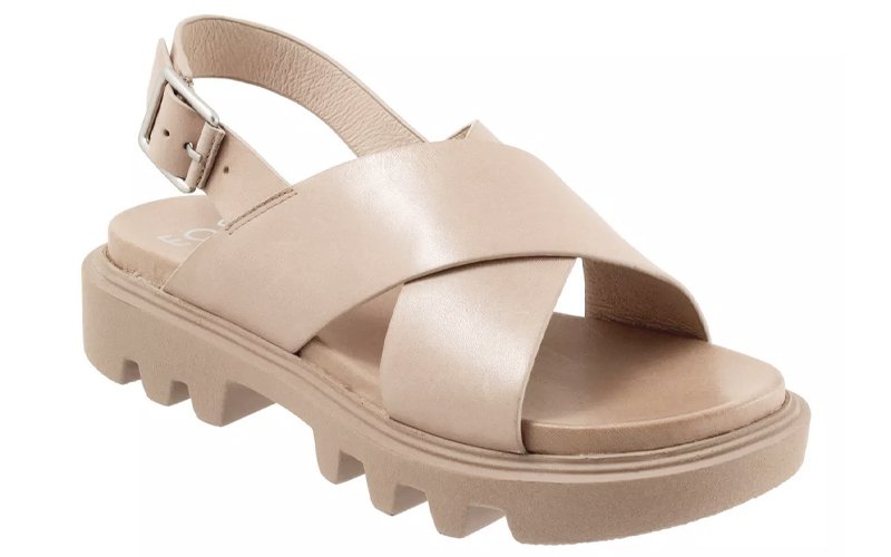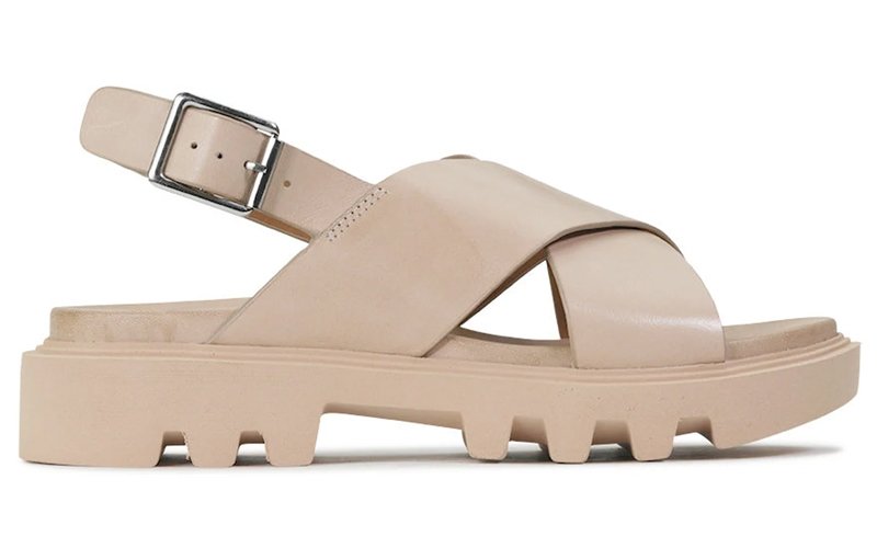 This chunky leather sandal offers a little cushioned lift, with a casual crossover strap and sling back around the heel.