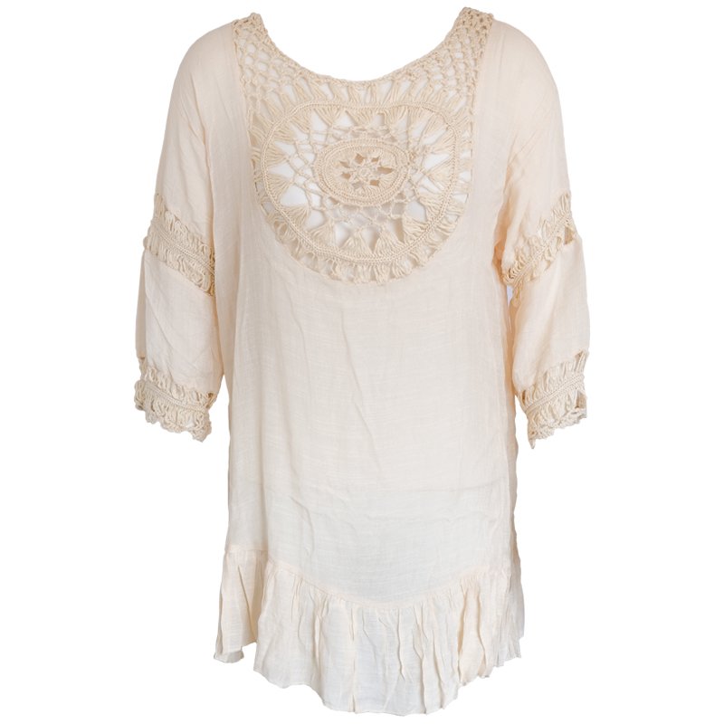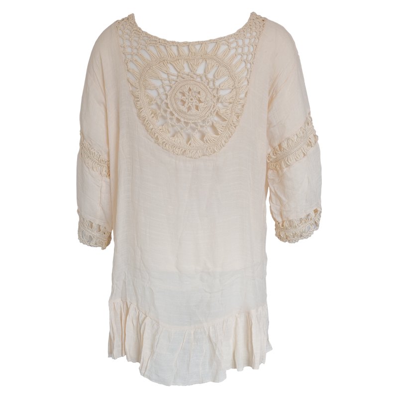 The Frilled Top is made of lightweight semi-sheer Rayon, with Crochet cut-out details on the front and back.
