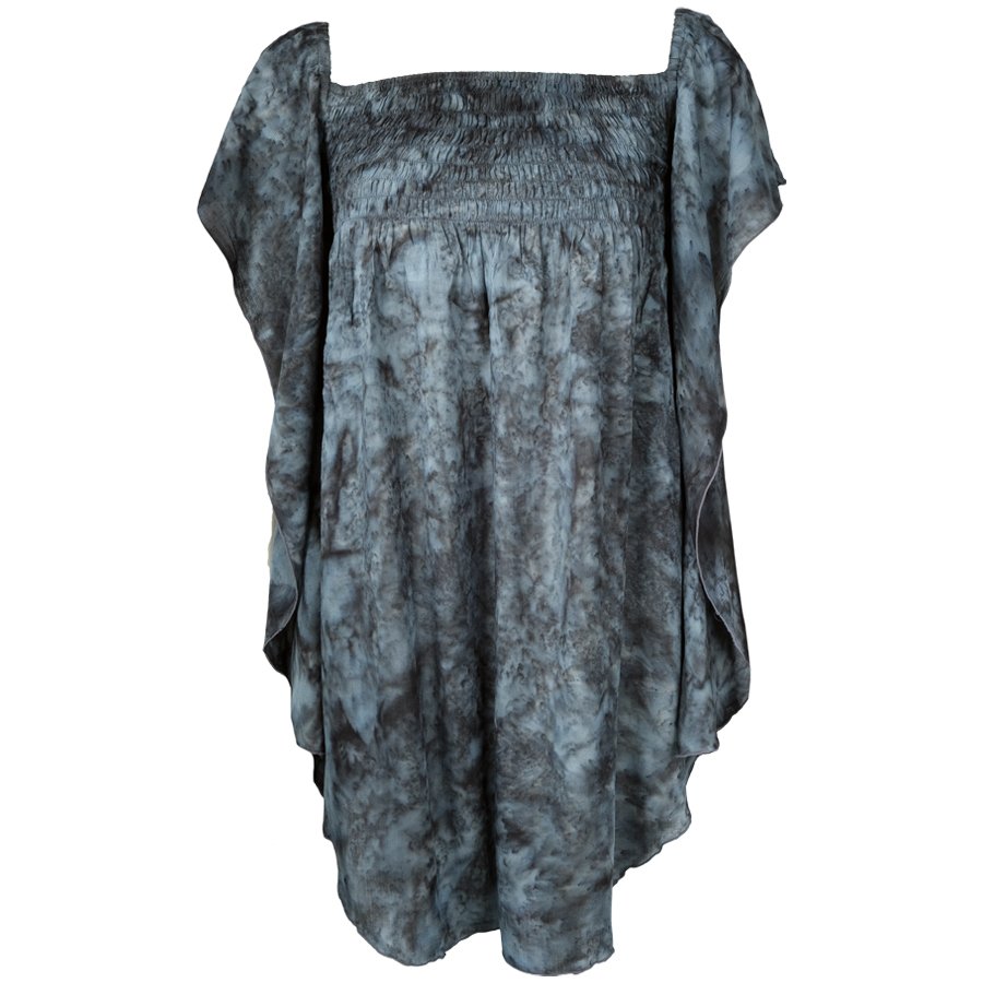 Incredibly soft cotton creates this feminine and flattering top.The bodice is shirred for a perfect fit.The fabric is a delight to wear next to the skin. Light, soft and very, very comfortable.A one Size garment best suited to sizes 8-14.Each item is hand dyed so the placement of colour and pattern will vary with each garment.