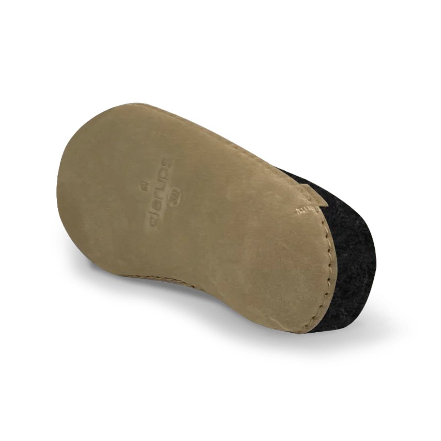 Felt slip-on of 100% pure natural wool with a sole of soft vegetable tanned calfskin.