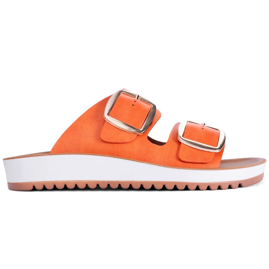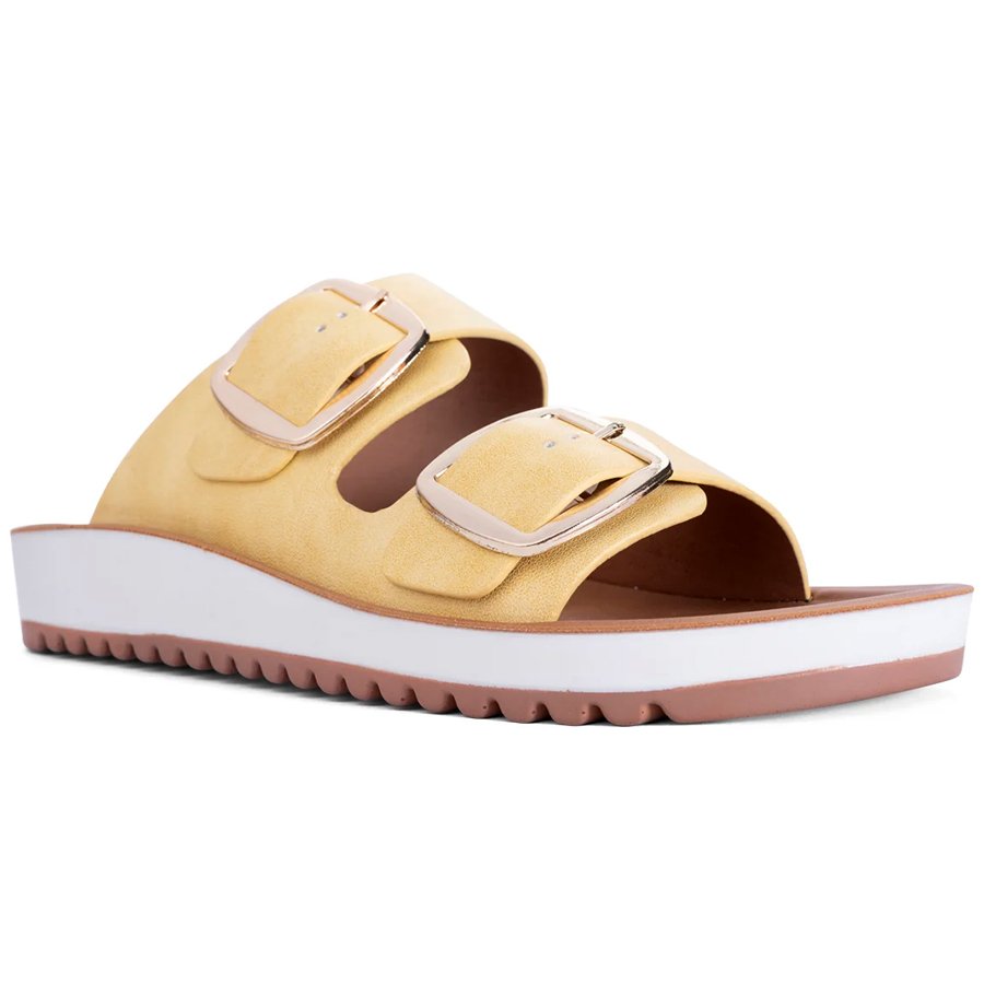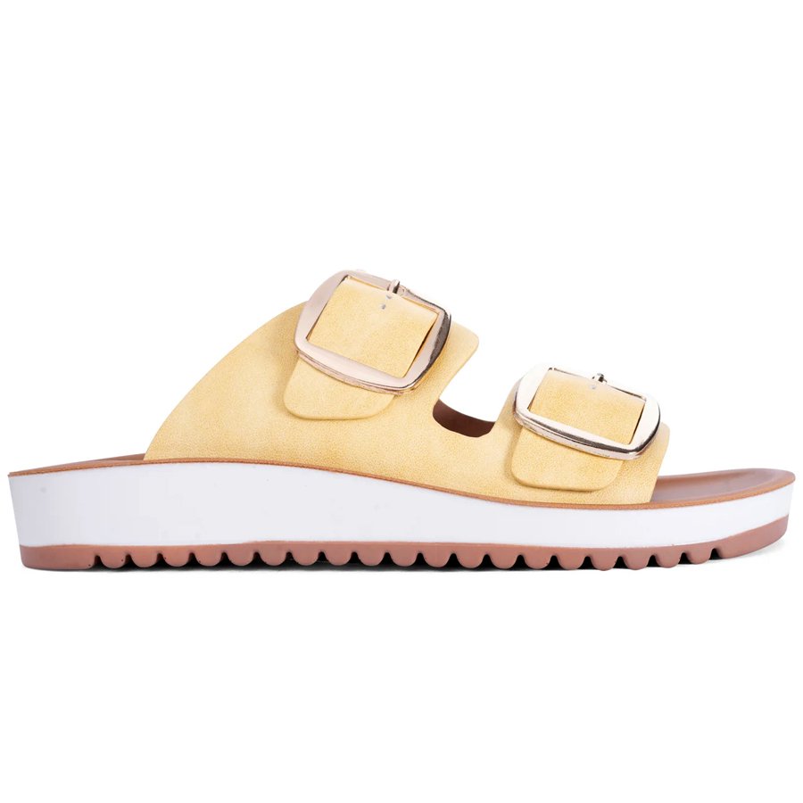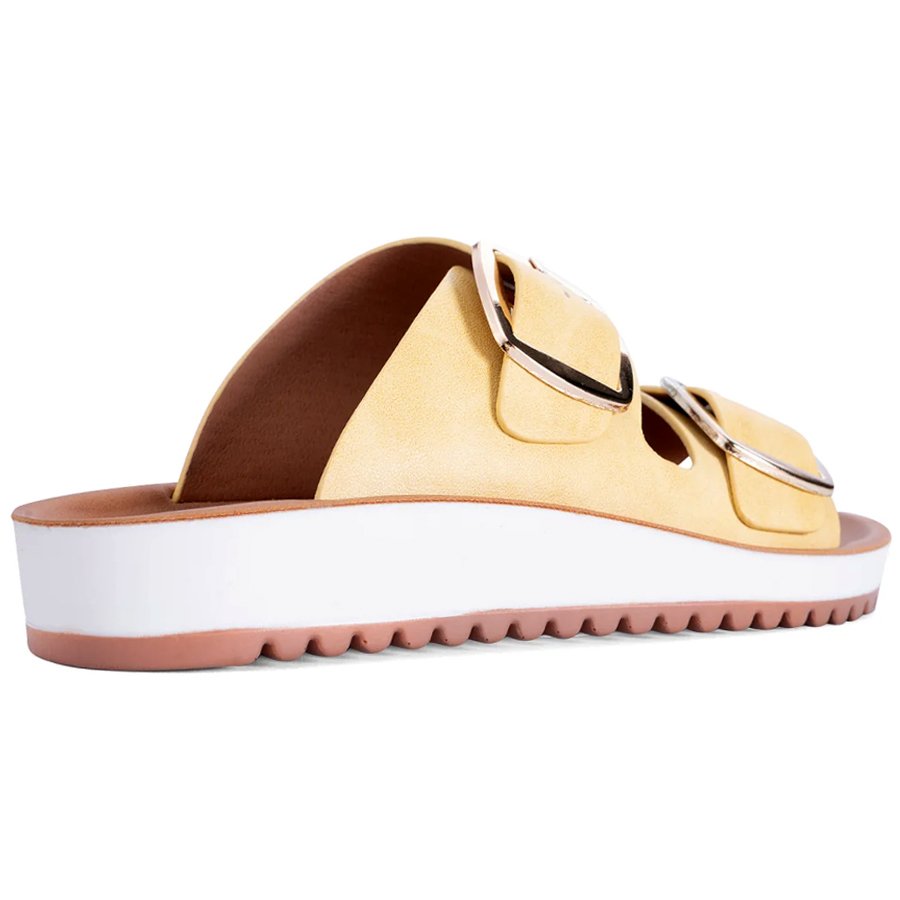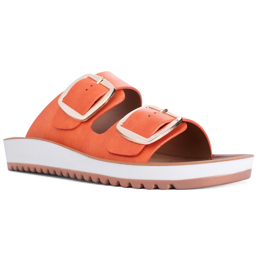 These classic slides feature double adjustable buckles and a low wedge heel, combining timeless design with modern comfort.