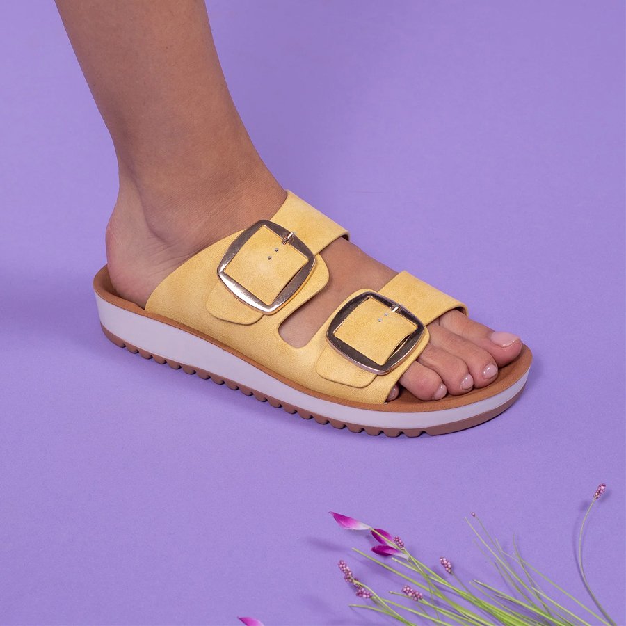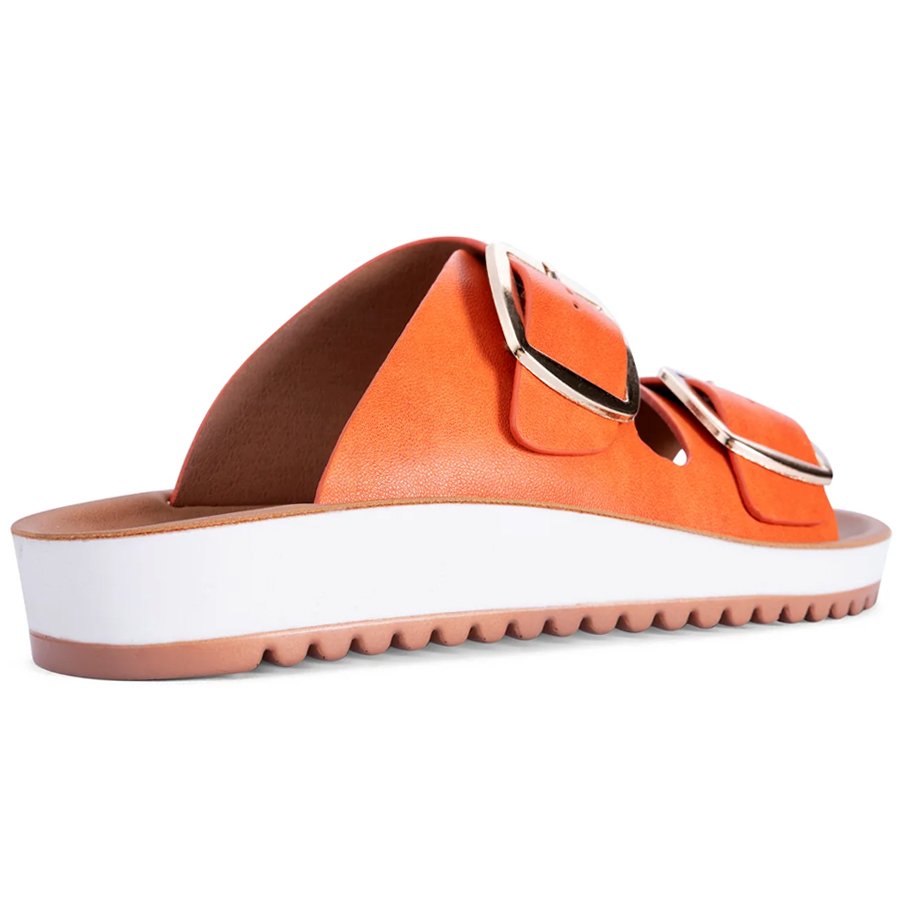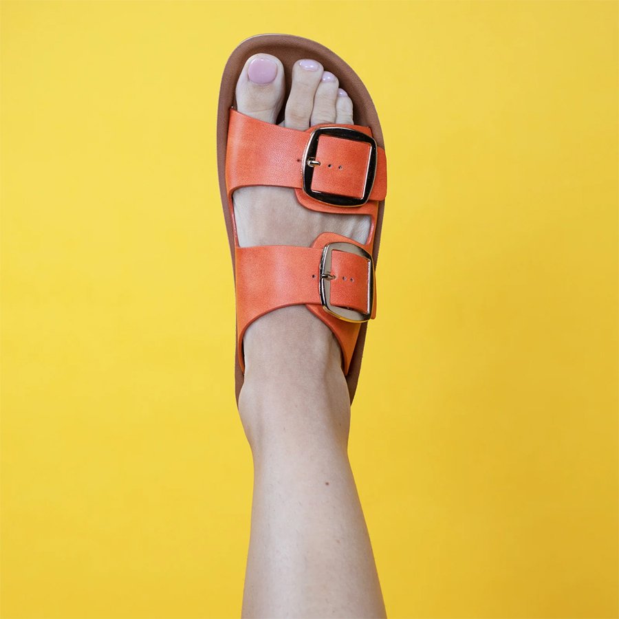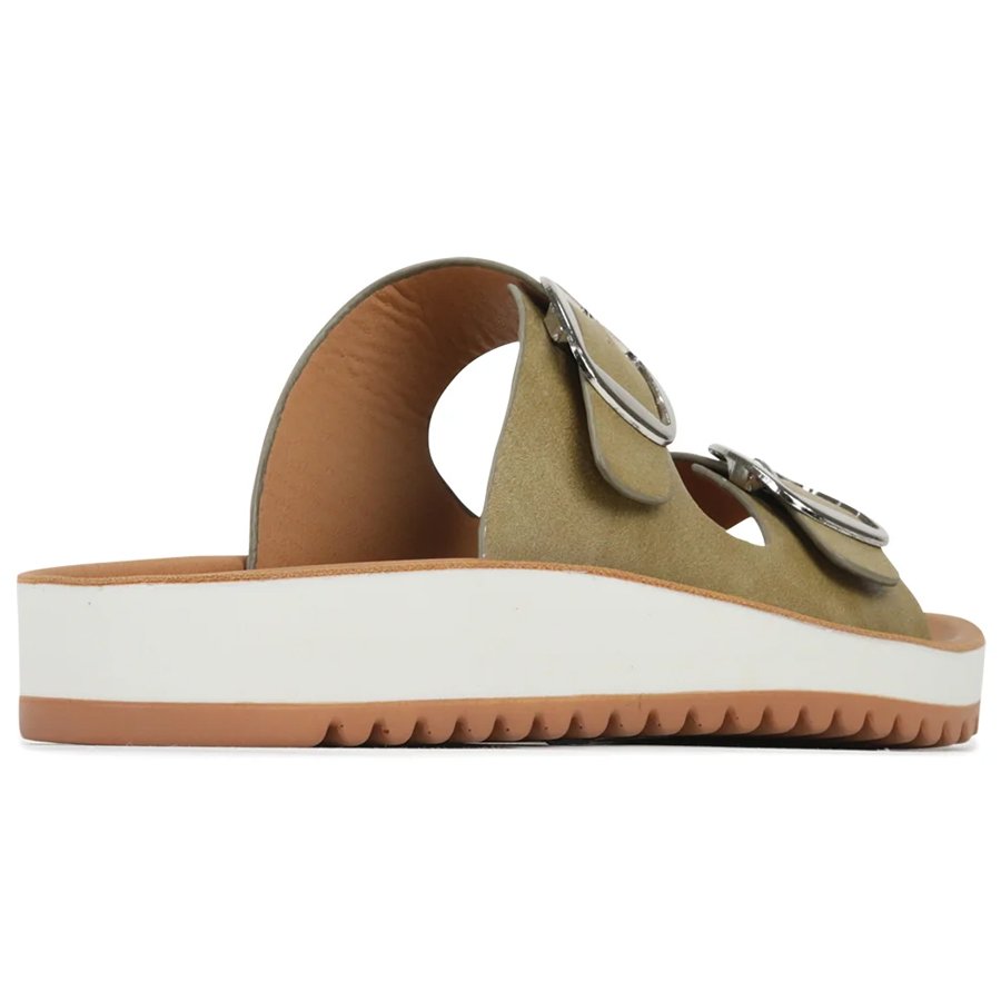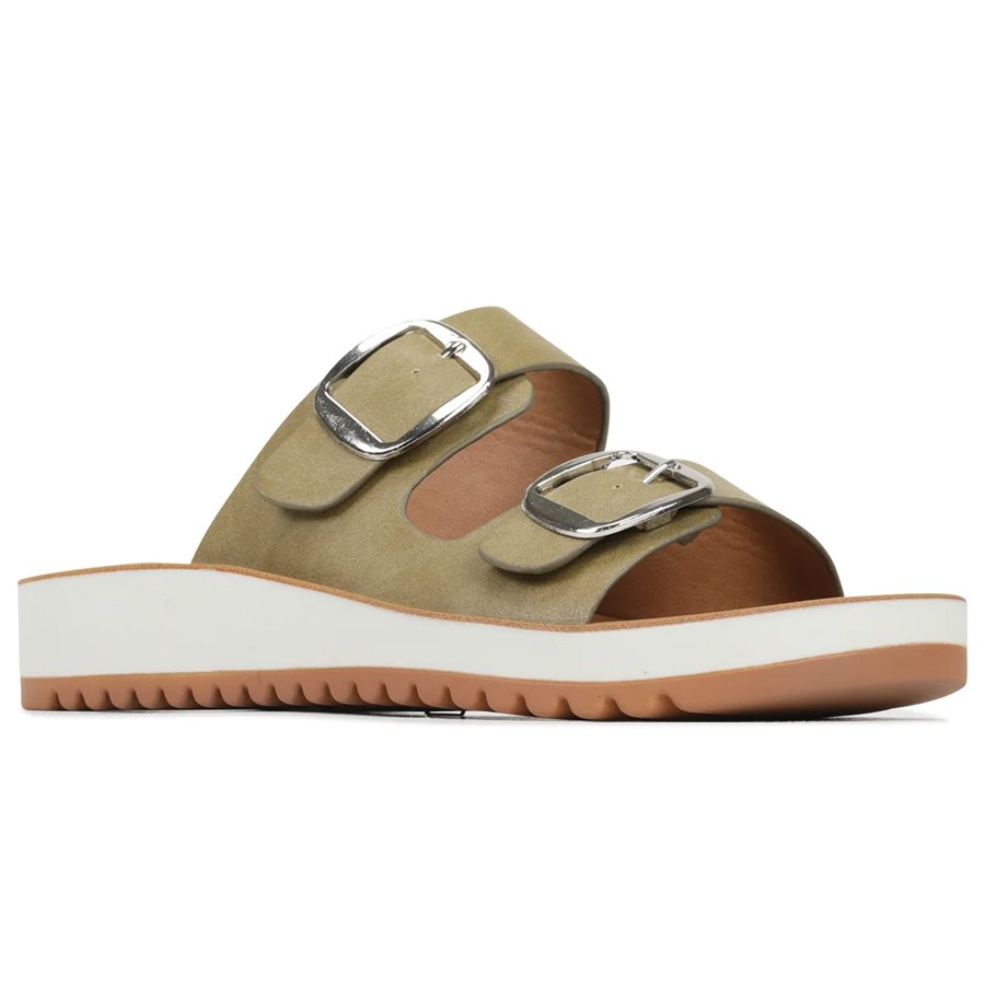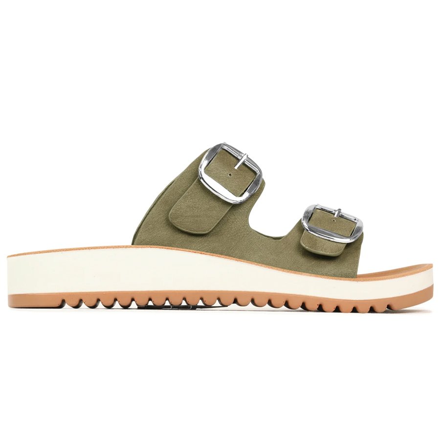These classic slides feature double adjustable buckles and a low wedge heel, combining timeless design with modern comfort.