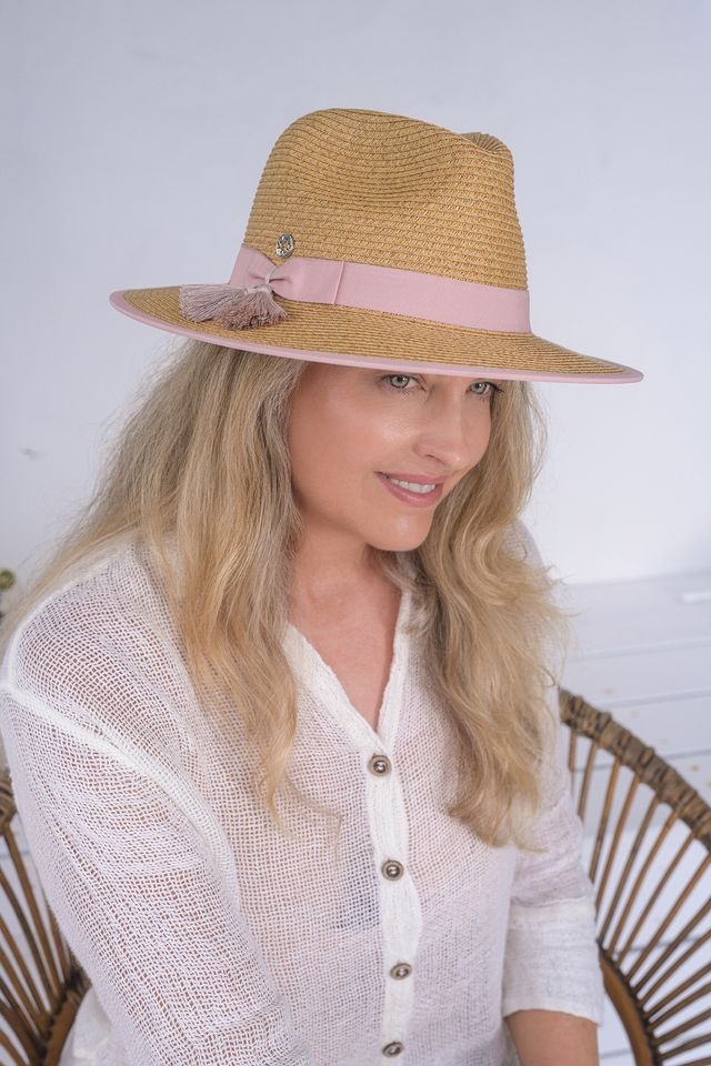 Elevate your summer style with the Sundaise Sabrina Panama hat, featuring a delicate pink ribbon and playful tassels.