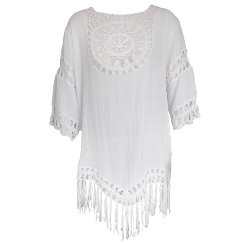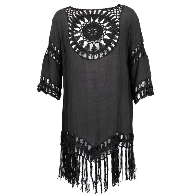This Tassel Top is made of lightweight semi-sheer Rayon, with Crochet cut-out details on the front and back.