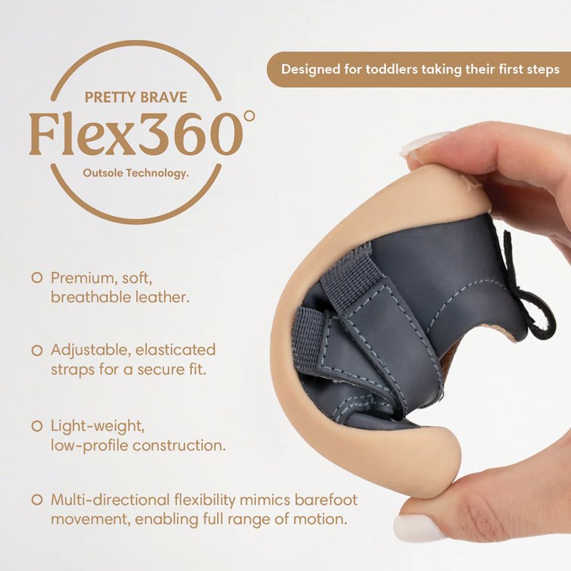 The custom Flex 360° outsole promotes natural movement, splaying and comfort, while padded ankle support and double hook and loop straps ensure a secure fit. With easy foot access and a secure fit, this style helps make the step from crawler to walker that much easier.